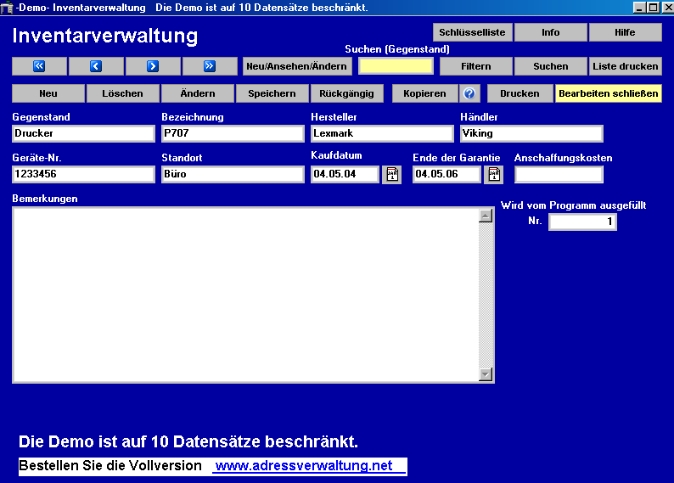 In der Demoversion ist die Anzahl der Datensätzen beschränkt.
